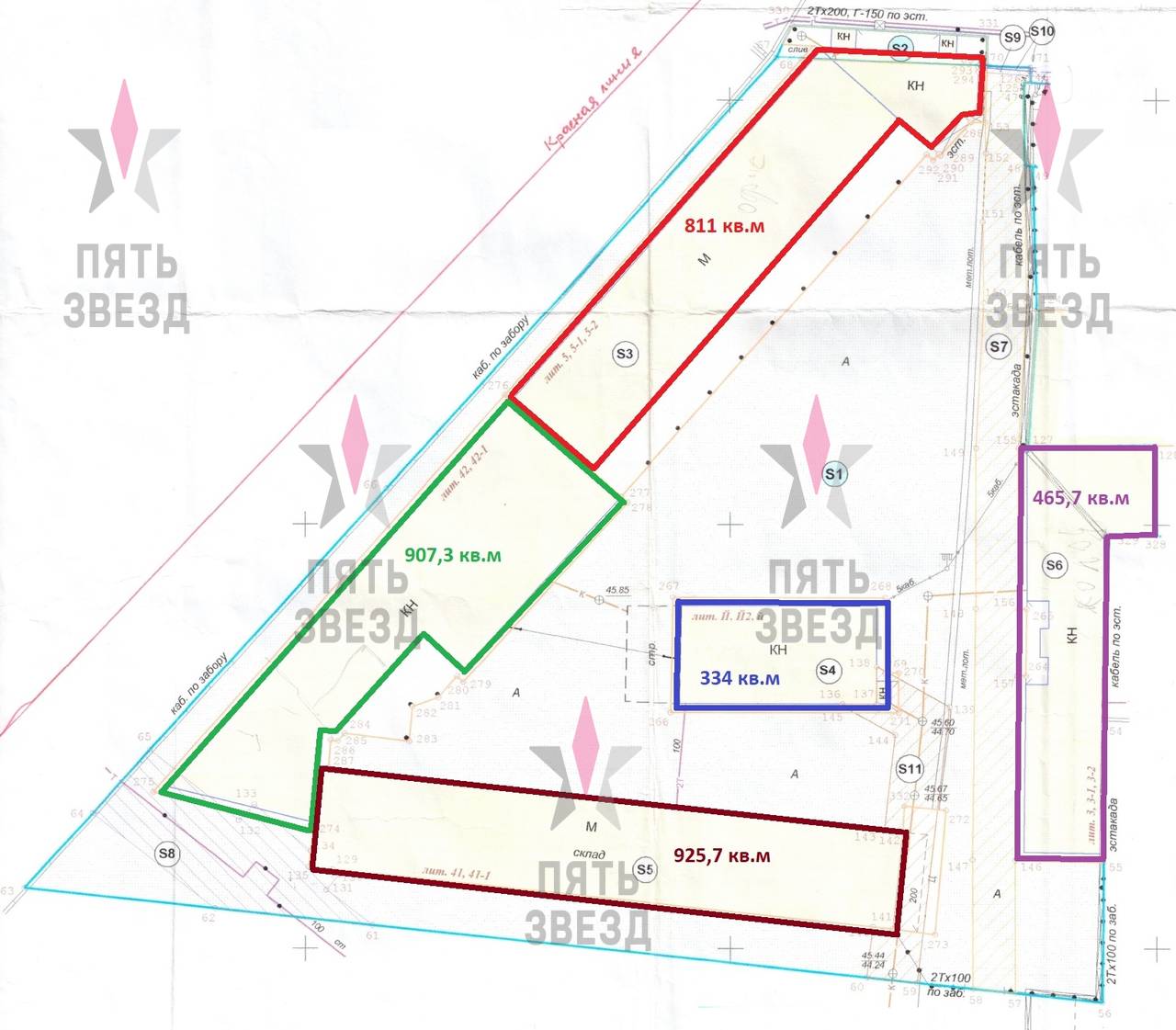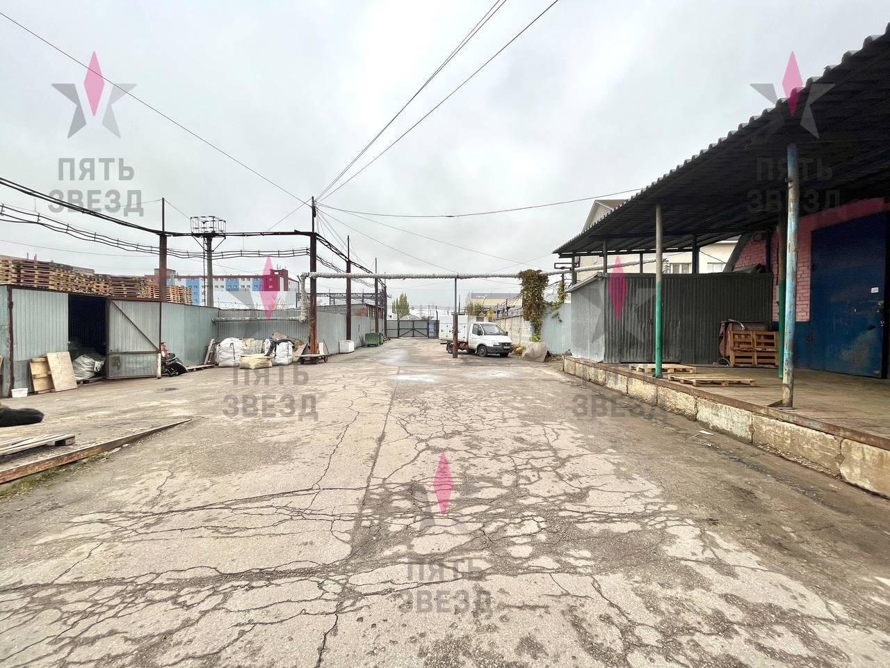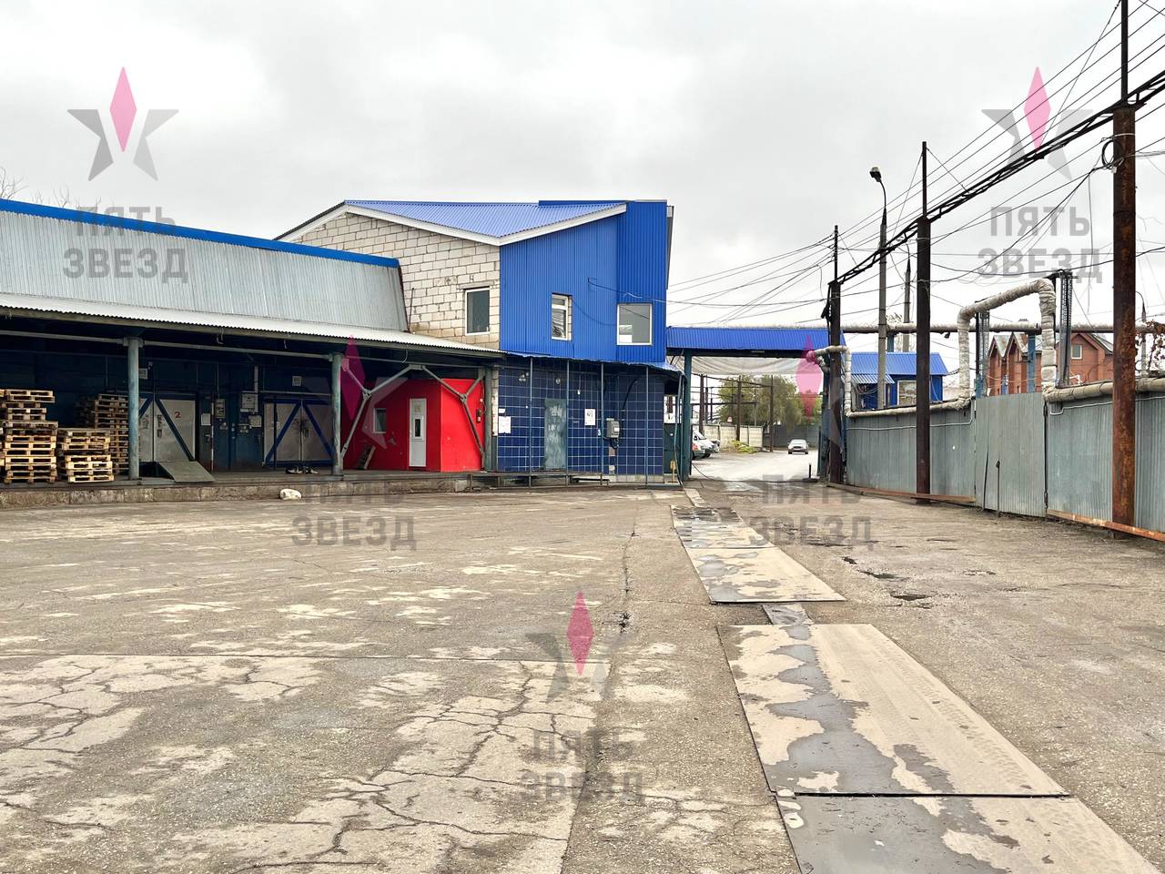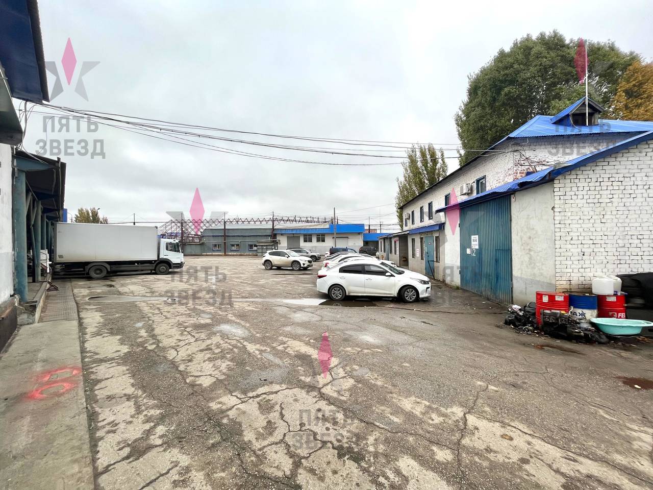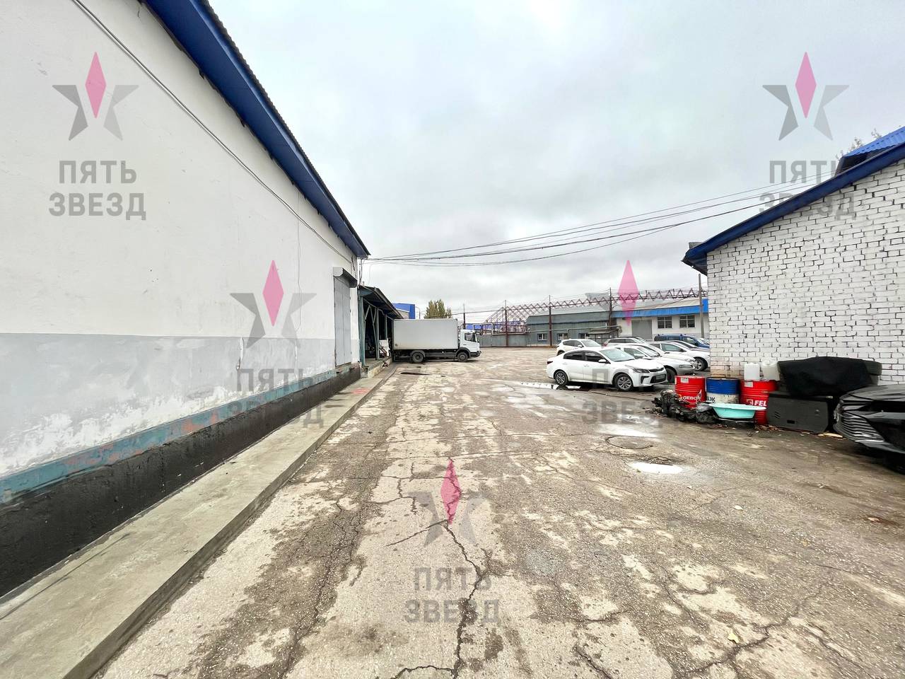 На участке расположены нежилые здания общей площадью 3445,2 кв.м: 907.3 кв.м, 925.7 кв.м, 811.5 кв.м, 465,7 кв.м, 335 кв.м, используемые как теплые склады – 2133 кв.м, складские площади с морозильными камерами - 627 кв.м, мастерские- 200 кв.м, офисы - 405 кв.м., торговые - 80 кв.м. Выделенная электрическая мощность составляет 193 кВт, своя газовая котельная, вода подключена от соседнего объекта, канализация выгребная яма.